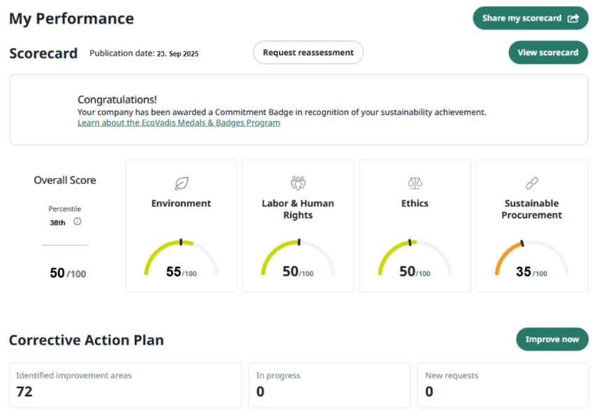 EcoVadis ist eine weltweit etablierte Plattform zur Bewertung der Nachhaltigkeitsleistung von Unternehmen in den Bereichen Umwelt, Arbeits- und Menschenrechte, Ethik und nachhaltige Beschaffung.